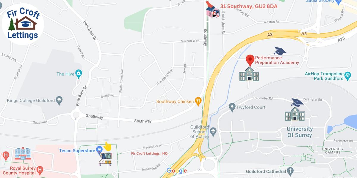 7 minutes walk University of Surrey, GSA, Hospital and Tesco. PPA 3min walk. Italia Conti Arts Centre and Academy of Contemporary Music is short cycle ride away. Co-op, and local shops 2min walk. This stunning bright five bed, two large luxurious bedroom, two washrooms with showers one on each floor, a quite residential area with driveway parking. Laminate flooring through out with living room, Bedroom four is large single which can accommodate double bed if required. Academic year 2026/27