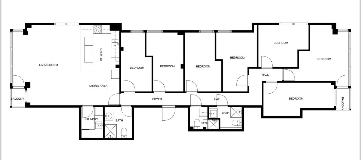 This spacious 7 bed apartment features three modern bathrooms, a large open plan living and dining area, and impressive floor-to-ceiling windows.