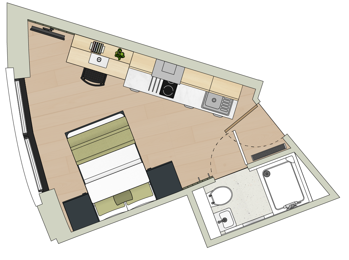 Your private en-suite studio paired with a shared living room, the perfect blend of independence and community in Nottingham’s creative hub.